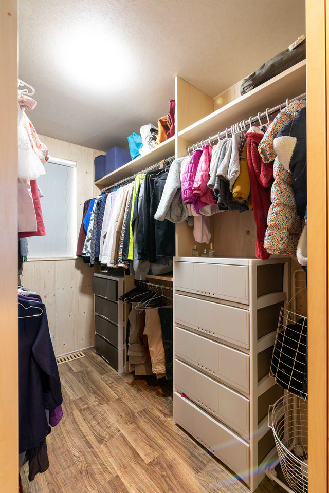 1階に3畳の広いウォークインクロゼットを配置。洗濯し衣類をしまうという家事動線を、ひとつのフロアで完結する設計です。