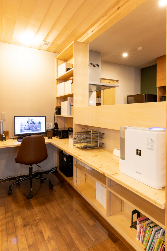 リビング・ダイニング続きで、キッチンの反対側に位置する空間ワークスペース。このワークスペースの入り口には横ルーバーの壁面をあしらい、飾り棚を演出。和室側は縦ルーバーを配してPCコーナーが丸見えにならず、木調の温かみを感じさせる造り。本棚組み込みのL型カウンター、縦・横のルーバーともに、道産トドマツで仕上げています。