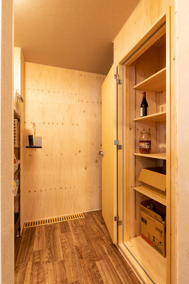 造作の棚を豊富に配したパントリー内部。右手は保冷庫で「冬場、外気を取り入れてちょうどいい温度で冷やせるため、野菜や果物が長持ちします」と一原さん。