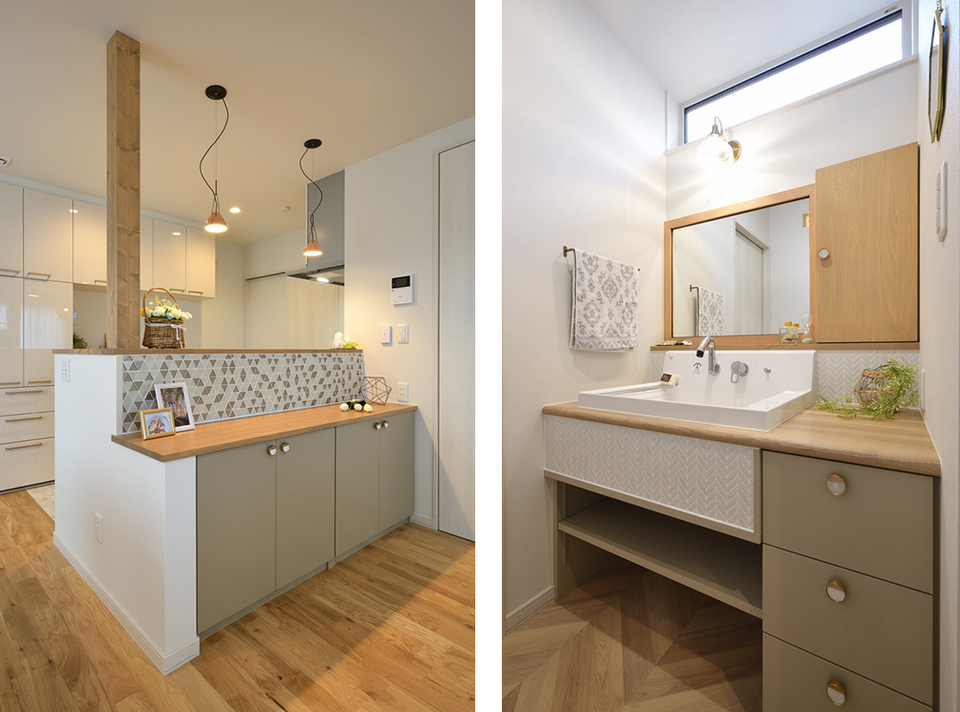 左/キッチン前の収納カウンターは、三角形のガラスタイルを貼った壁面に合わせて、扉の色もエクリュ(淡いベージュ)に。