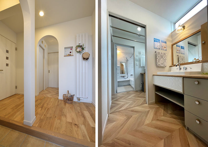 福嶋さん 玄関ホールからは、独立した洗面室→脱衣室→浴室が続きます。コートを脱いだら洗面室でうがい手洗いを済ませ、バックヤードで部屋着に着替えればおおむね安心。お風呂に入ってリセットしたら、もう完璧ですね。