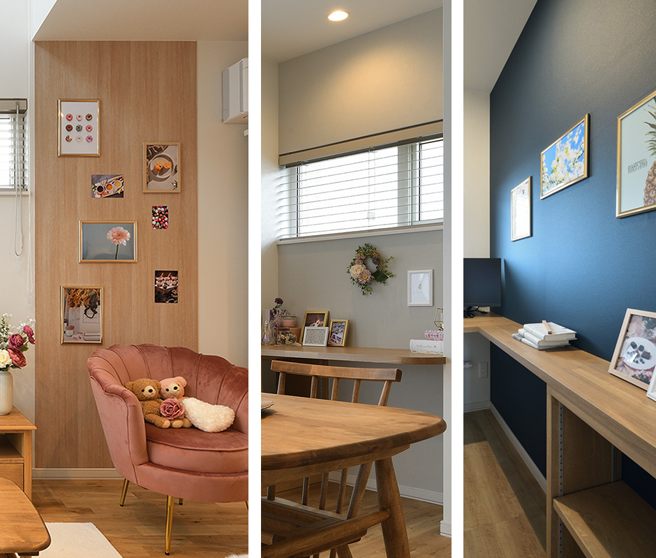 例えばリビングのアクセントボードや、ダイニングのカウンター前、書斎の壁はマグネットタイプになっていて、好きなものを貼って楽しんでいただけます。