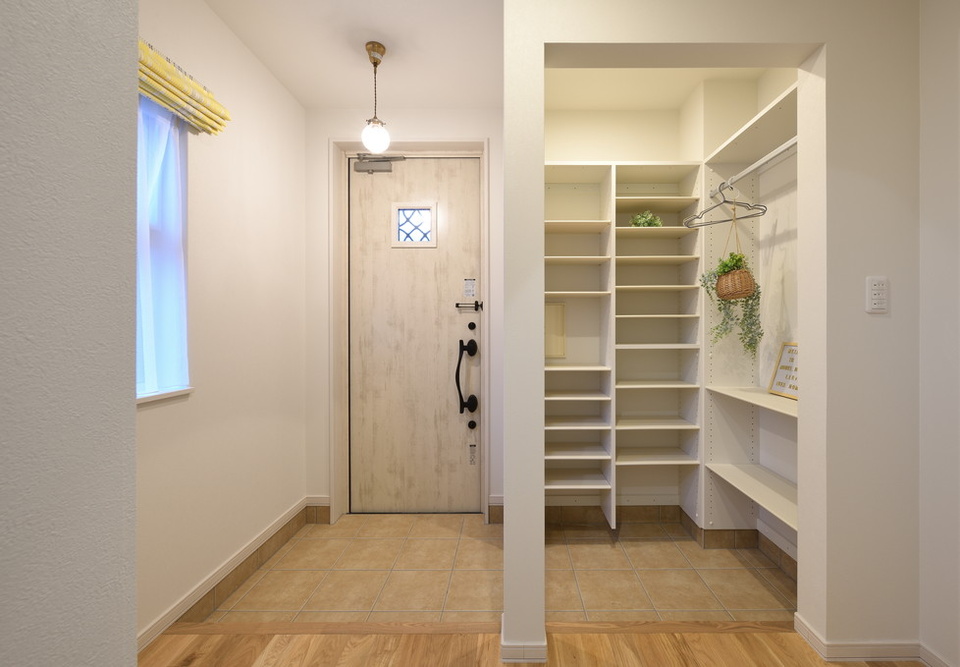 シューズクロークを備えた玄関。ここでコートを脱いで、コート掛けに収納。