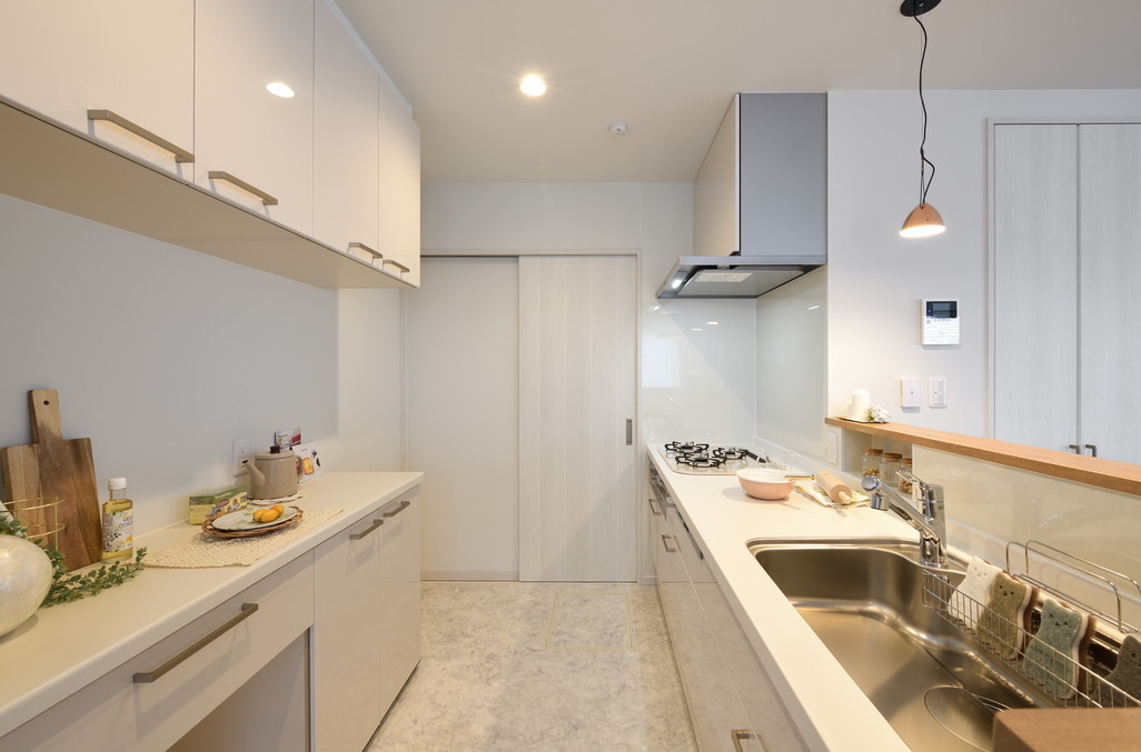 キッチンは使いやすく収納も充実しています。引戸の向こうには食品庫兼ファミリークロークが続きます。