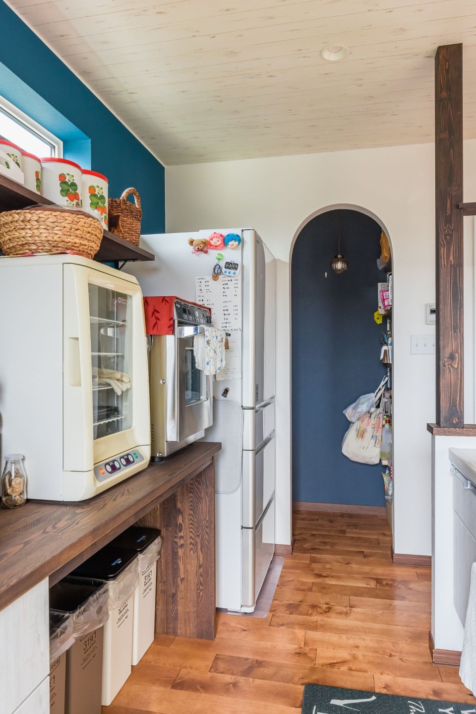 キッチンの横にはパントリーも設置。扉がないので調理中の行き来もスムーズです。常温で保管できる食材はここに収納することでキッチンが整理整頓できます。