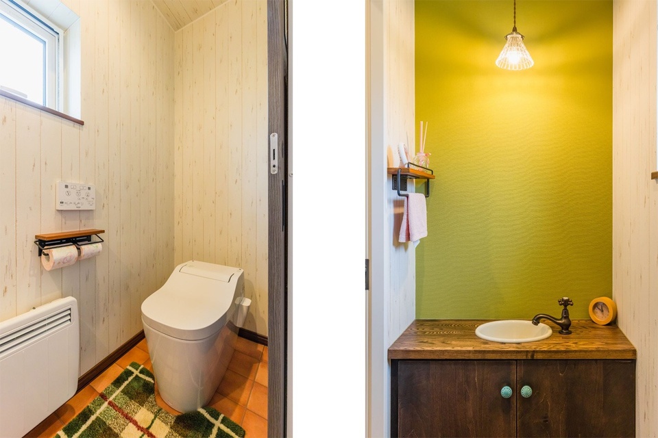 お手洗いも造作の手洗い台とホーローのシンクで統一しました。蛇口のフォルムも美しく、思わず手を止めて見入ってしまいました。