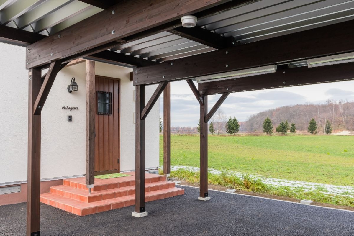 空と畑だけの風景の中に明るい白壁が映えるN様邸。北海道、十勝・音更町で40代のご夫婦と2人のお子さんが暮らしています。ふたつの屋根からカーポートまで続くフォルムが美しく、西洋を思わせる十勝の風景によく馴染む外観です。