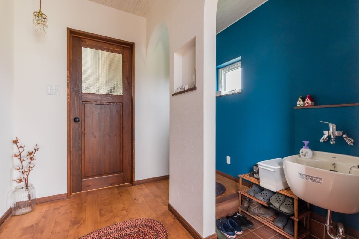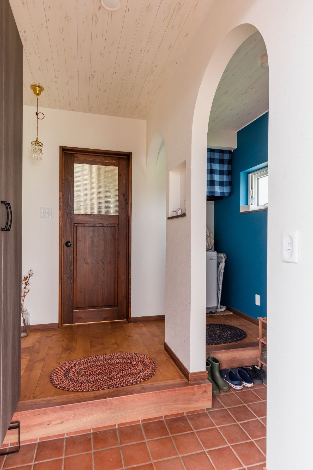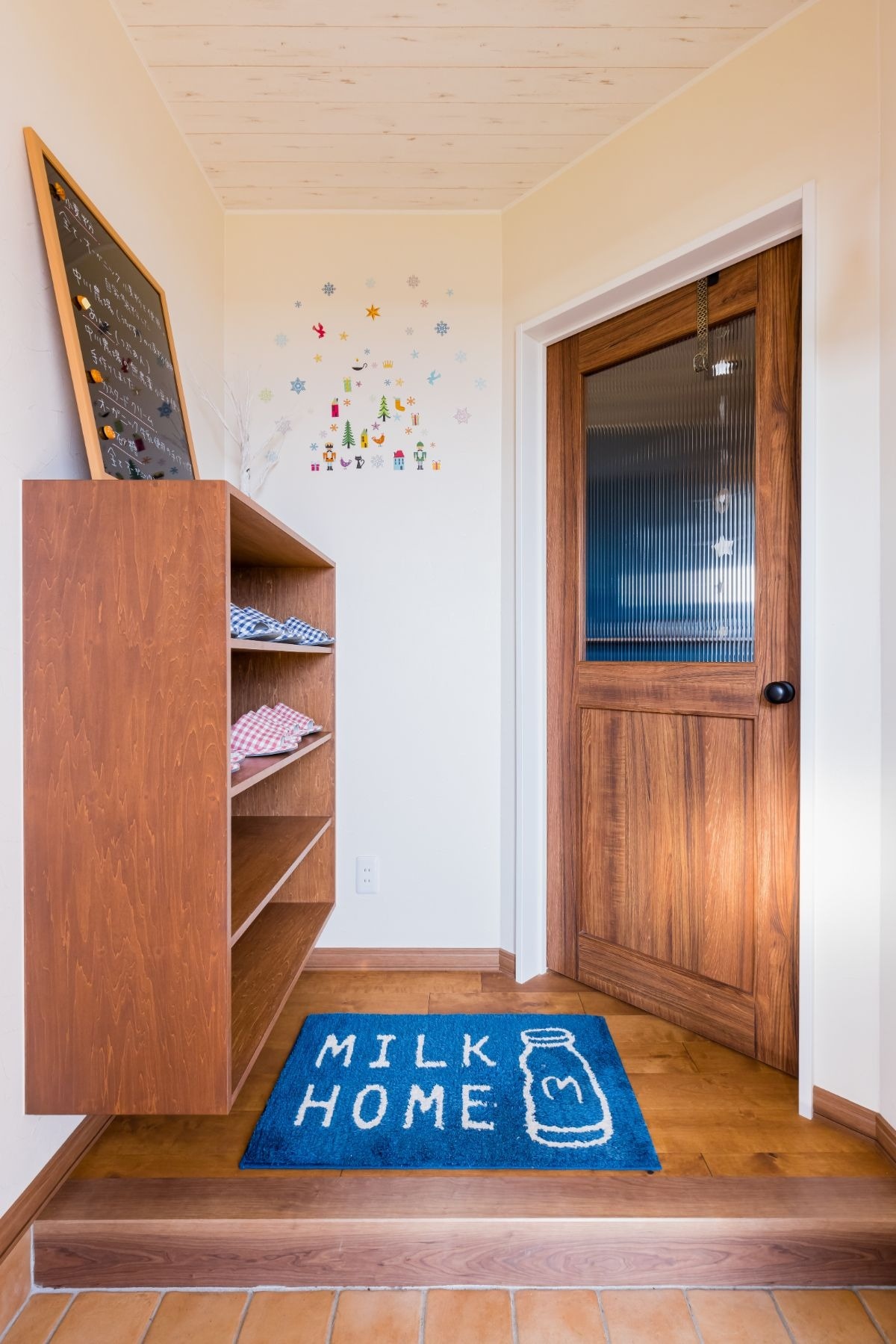 玄関を入るとまず迎えてくれるのがテラコッタ調の床タイルです。無垢材の床、天然木のドアと少しずつ深くなる茶系の色味に、温かく奥へと誘われるような感覚を覚えます。