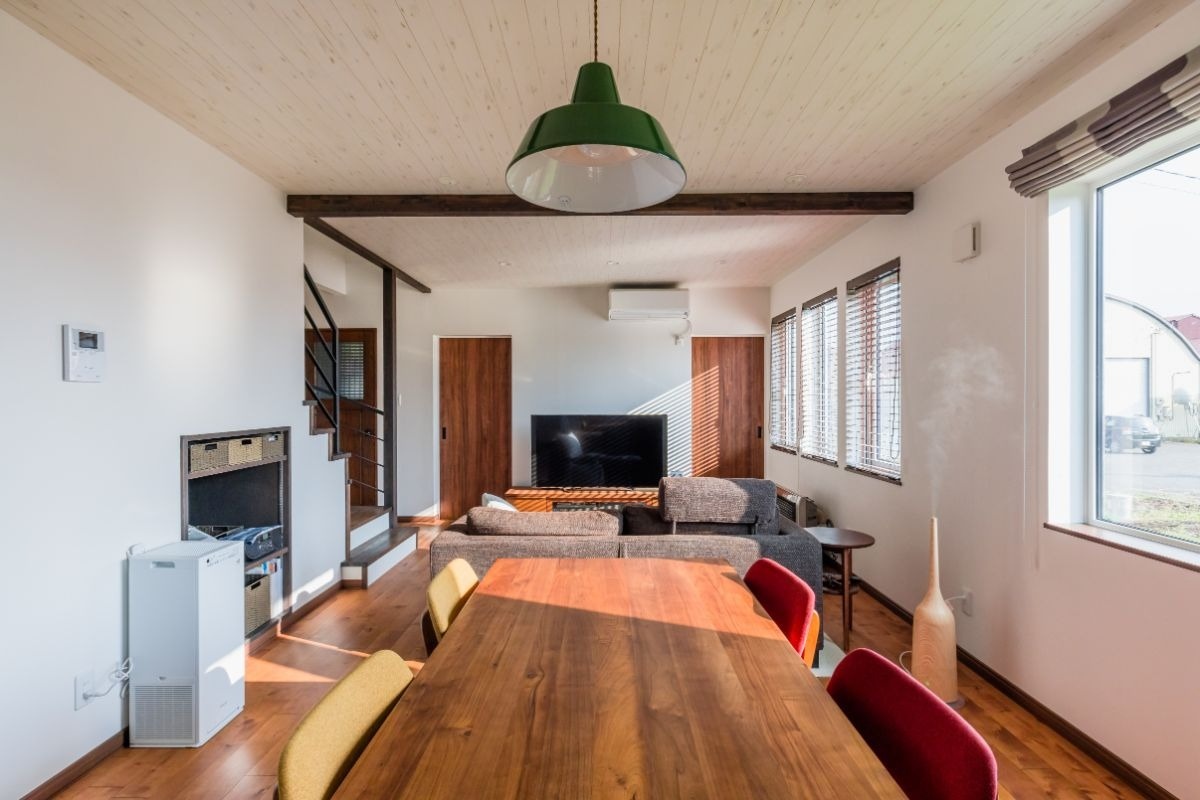 扉を開けると広がるLDKは、木をふんだんに使い、温かみのあるカントリー風の雰囲気。白を基調とした明るい空間を、ダークブラウンの梁や柱、ソファと壁紙のカラーとが引き締め、どこかモダンで垢抜けた印象になっています。