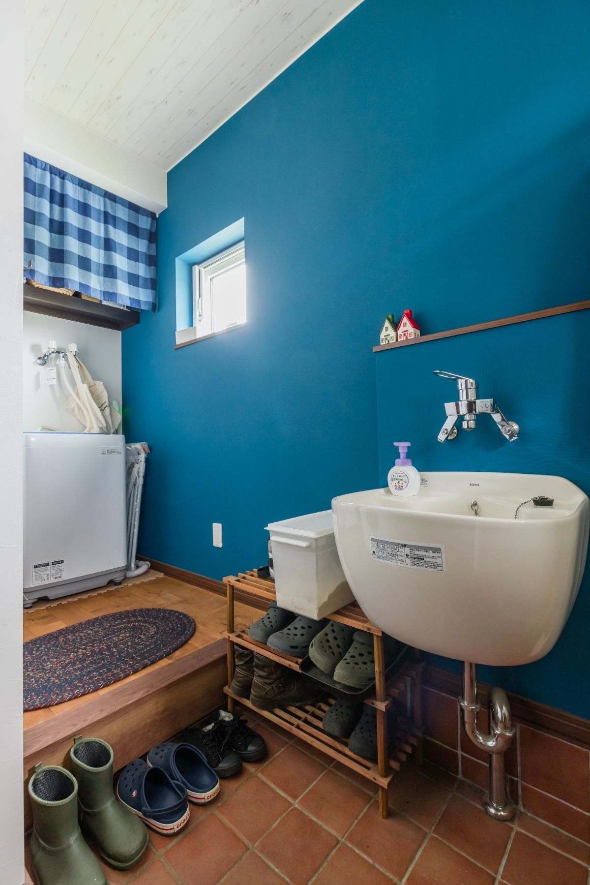 底が深く汚れ物を洗いやすいスロップシンク(SK)。奥には農作業着などを洗う洗濯機もあり、汚れたものを家の奥に持ち込まないための工夫がされています。農家さんだけでなく、小さなお子さんがいるお宅でも役立ちそうなスペースです。