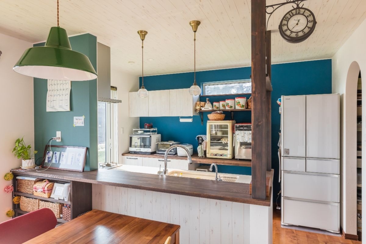 センスの光る対面キッチン。奥様がインターネットで選ばれたという照明が空間にリズムを与えています。