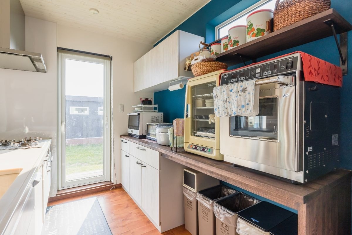 作業台の下に整然と並ぶゴミ箱は、家を作る前から幅や高さを計測してぴったりと置けるようにしたのだとか。上部の棚の高さも同様で、キッチンに立つ人にとって最も使いやすい形となっています。