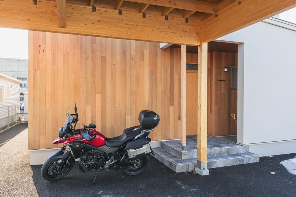 広々としてインパクトのあるカーポート。外壁のレッドシダーと色を合わせるため、ここから更に塗装予定です。
