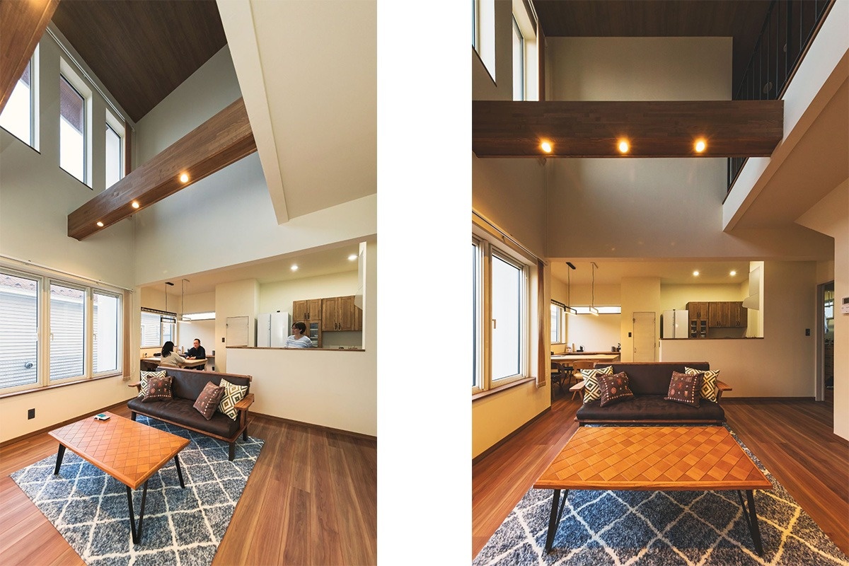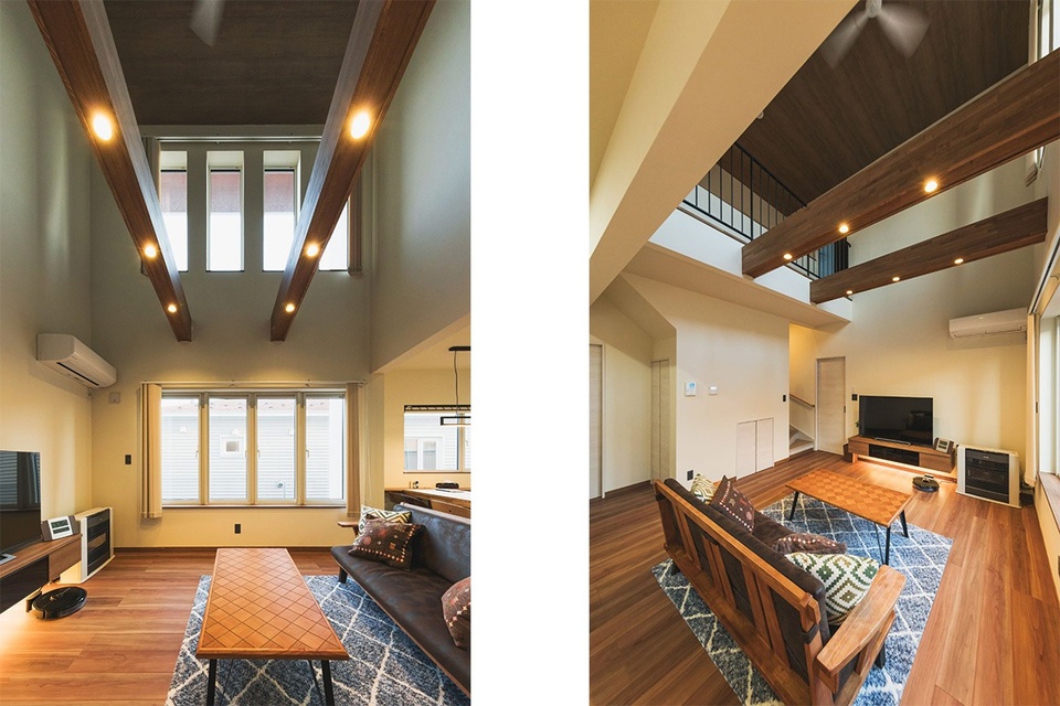 写真のLDKもご家族の希望した開放的な吹き抜け空間と存在感ある梁を入れ込んだ他は、社長のセンスで落ち着きと統一感のあるデザインに仕上げました。
