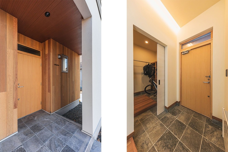 ポーチの天然石や木製玄関ドアから上質感が伝わります。