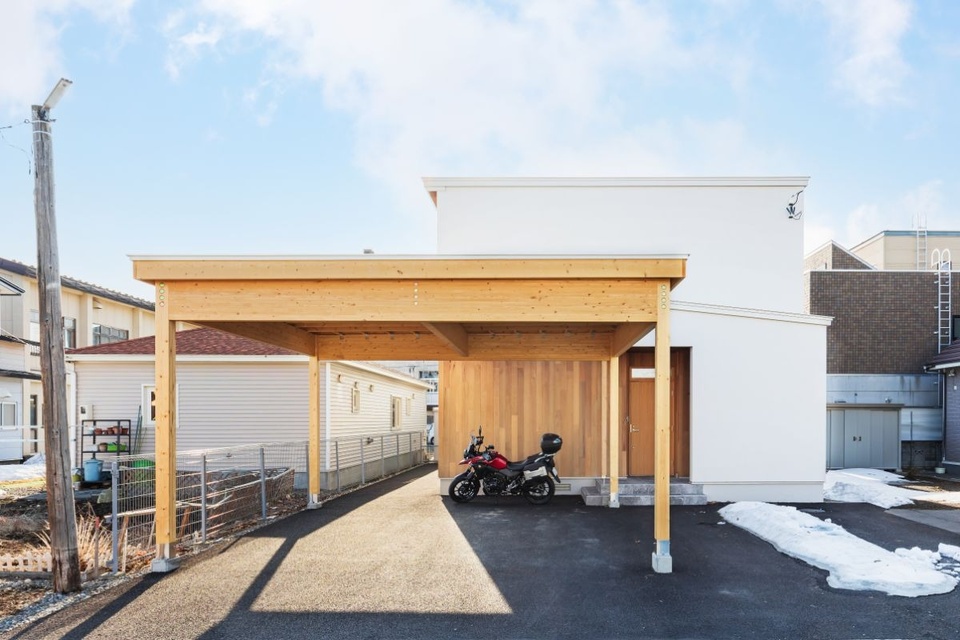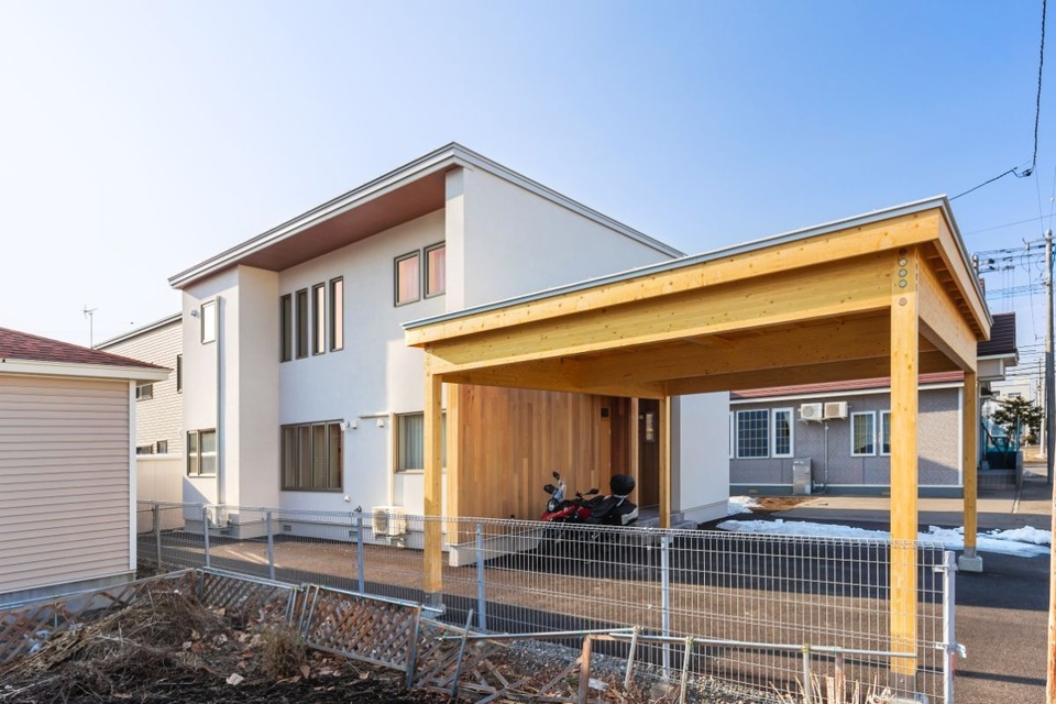 帯広市内の東、人気のある住宅街に建つ一棟の家。すっきりとした外観に背の高いカーポートがナチュラルな印象を与えています。
