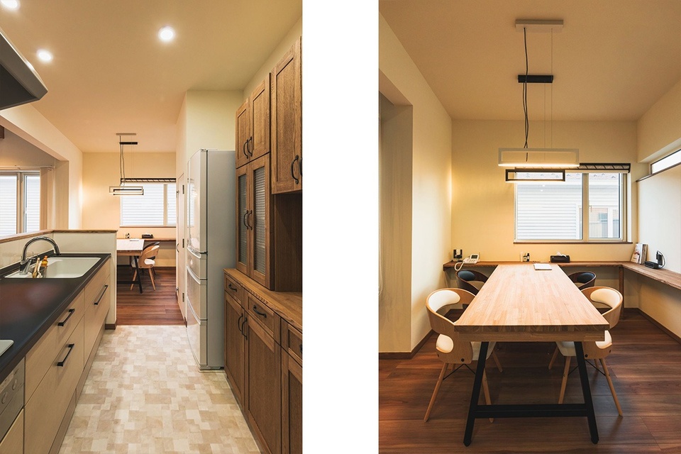 こちらはダイニングキッチン。キッチンの収納棚とダイニングテーブルは自社の造作で、使いやすいサイズに仕上げてあります。照明なども清水社長のセンスで「モダンでおしゃれに仕上がった」とご夫婦も満足そうです。