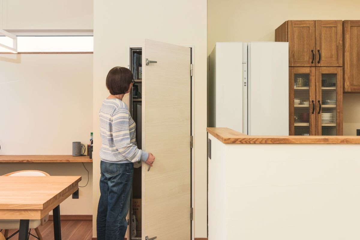 「お酒や食材を保管したくて」と設置を希望した食品庫。ダイニングからも取り出しやすい位置です。