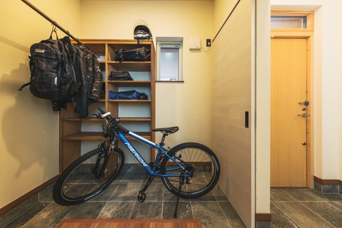 来客を気持ちよく迎えられるよう、強く希望したというシューズクローク。家の外と中の中間の場所として、自転車や猫のトイレもこの場所に置いています。猫トイレが臭わないよう、あらかじめ換気扇も設置しました。
