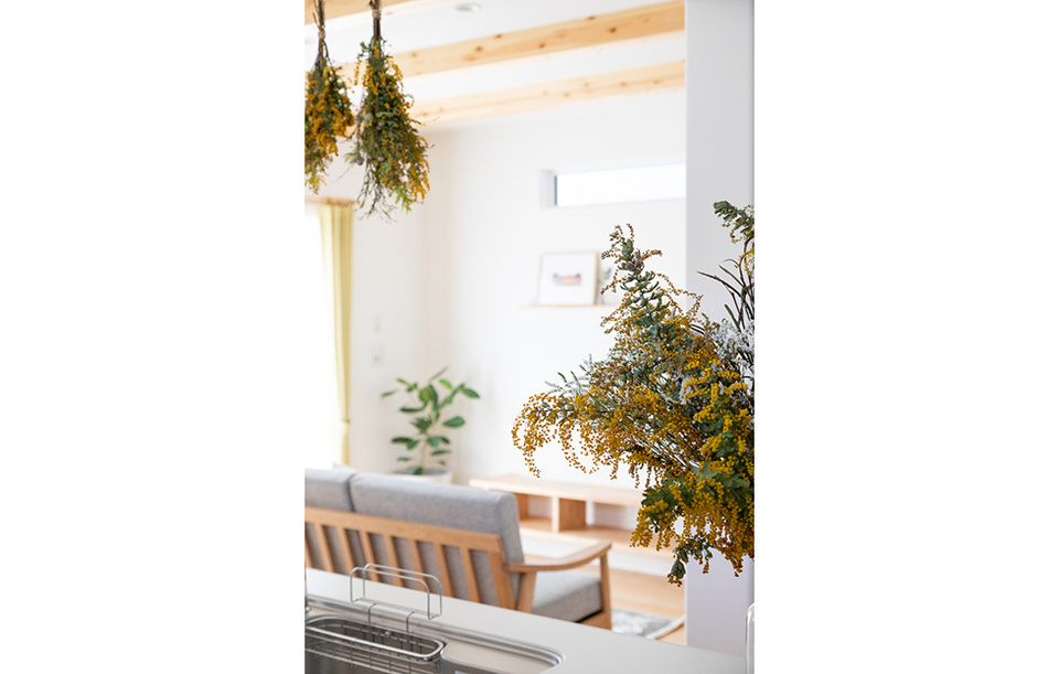 内装の多くに明るいゴムの木を使った、春を告げるミモザの花のような住まい。