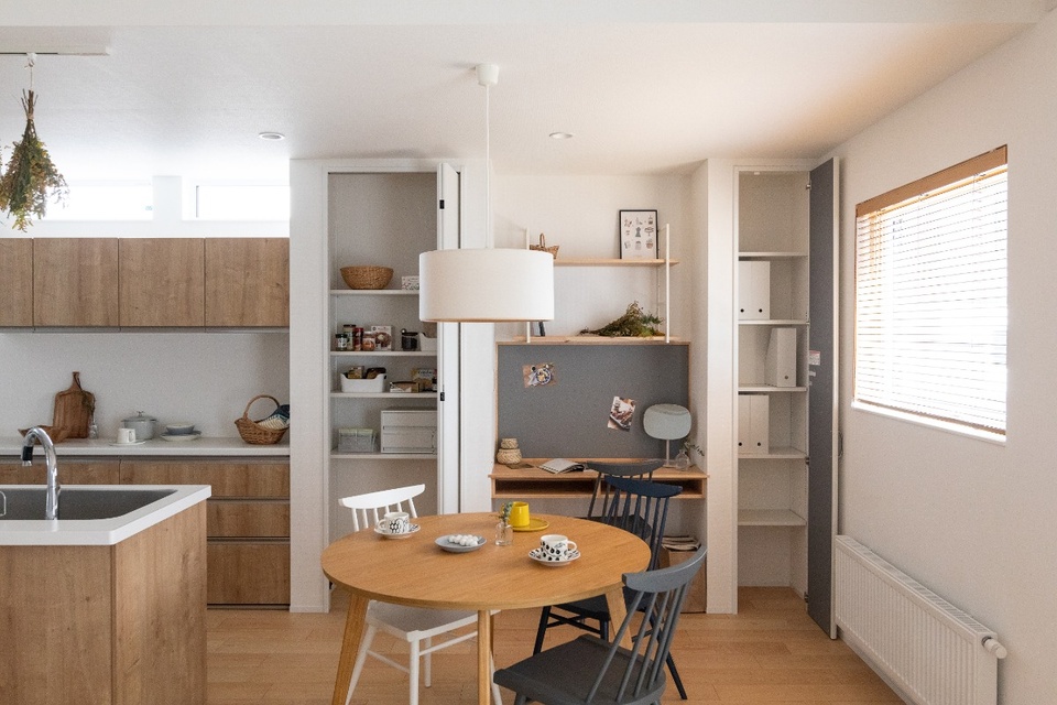 ダイニング壁面には、ストック用のパントリー、家事コーナー、書類や雑貨の収納を並べて配置。充実した収納で、いつもスッキリとした空間が叶います。