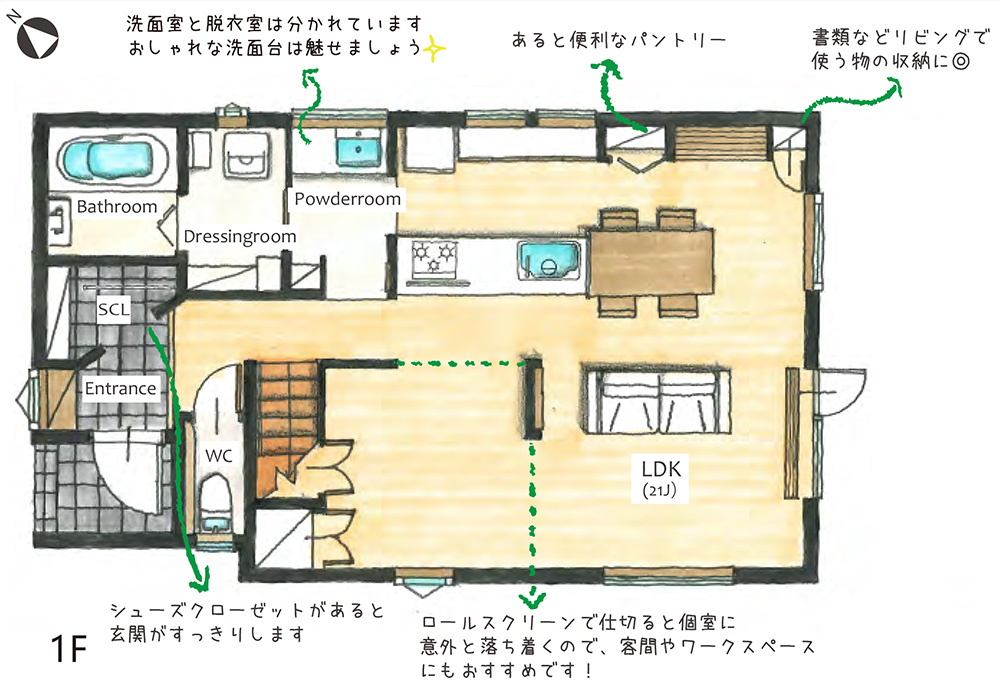 1階は使いやすい水回りとオープンなLDKで構成されています。