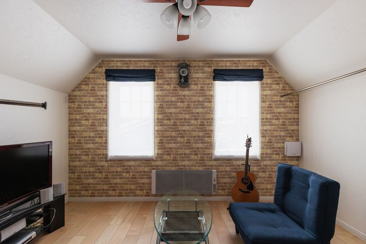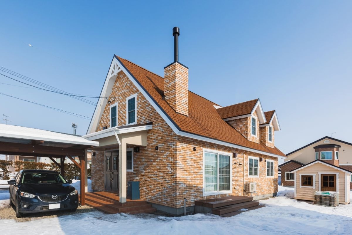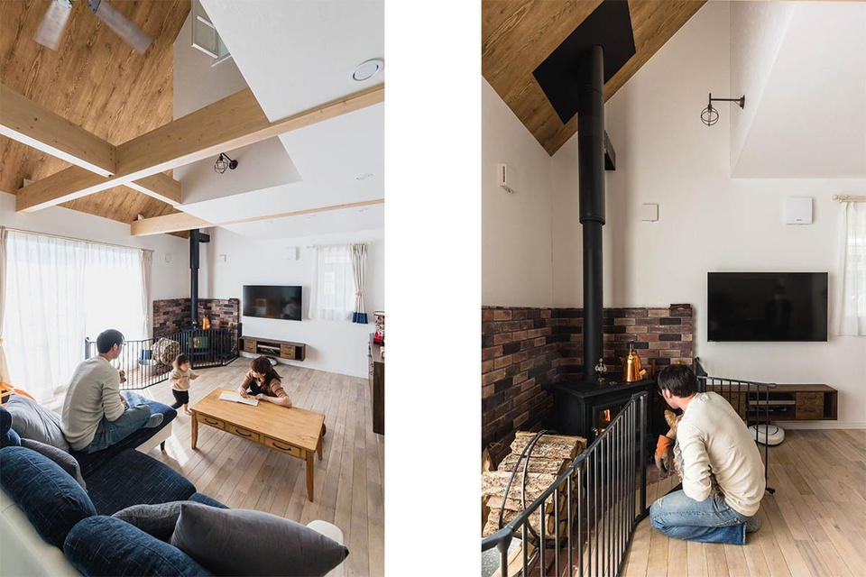 三角屋根を希望したのはご主人。「スタジオジブリのアニメ『魔女の宅急便』に出てくるシンプルで洋風な三角屋根の家に憧れていたんです。朝日社長は10寸勾配(45度)の三角屋根に薪ストーブの煙突やドーマ―(屋根窓)、外壁の色合いなども含めて洋風の外観になるように提案してくれました」