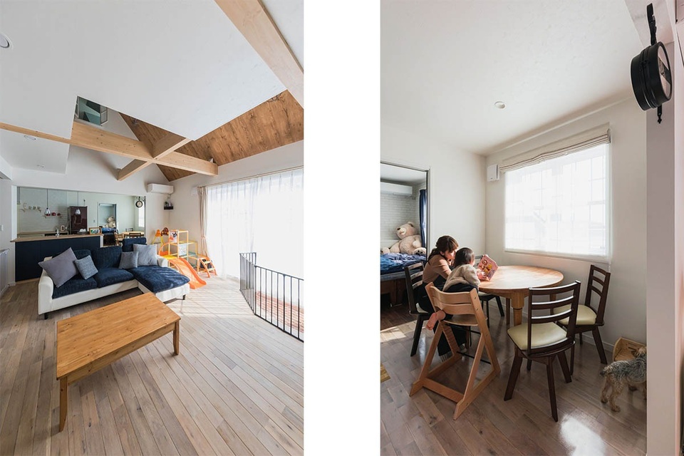 LDKは大きな吹き抜けになっています。キッチンの横にダイニングを配置することで、食事と寛ぎの時間を分け、配膳の負担軽減なども実現しました。