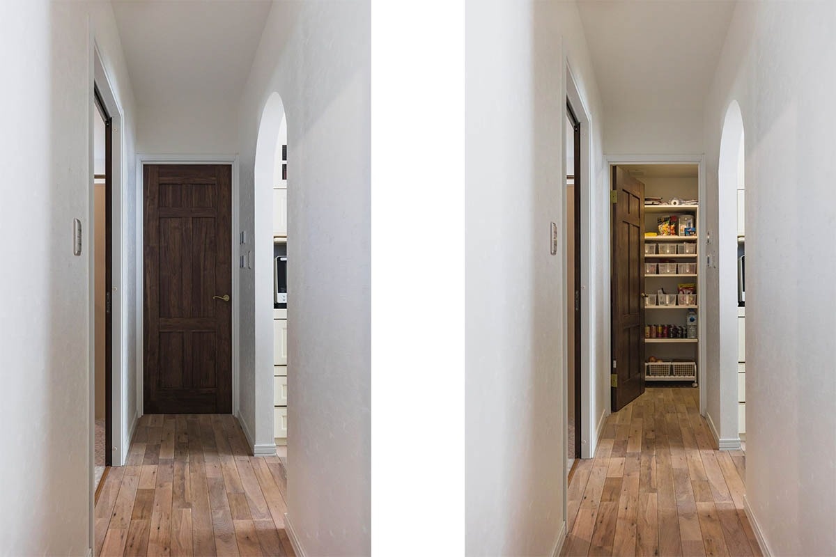 玄関からキッチンに向かう廊下には食品庫(パントリー)があり、買い物帰りにすぐ食品収納しやすいので大変便利でした。