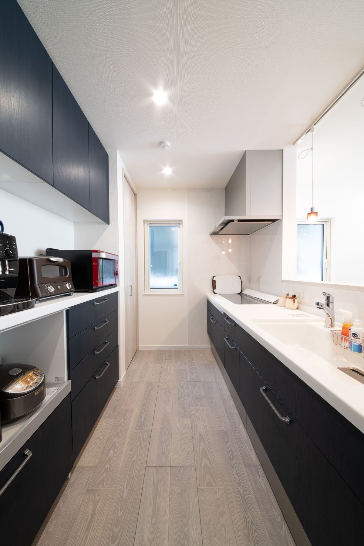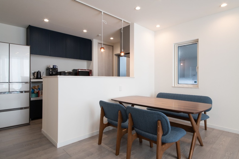 キッチン・ダイニングも余計な装飾は施さず、色で見せるシンプルな空間づくりを行っています。Zさん邸のメインカラーはネイビーとホワイト。ショールームで選んだキッチンセットの色を元に、全体の差し色をネイビーに統一しました。