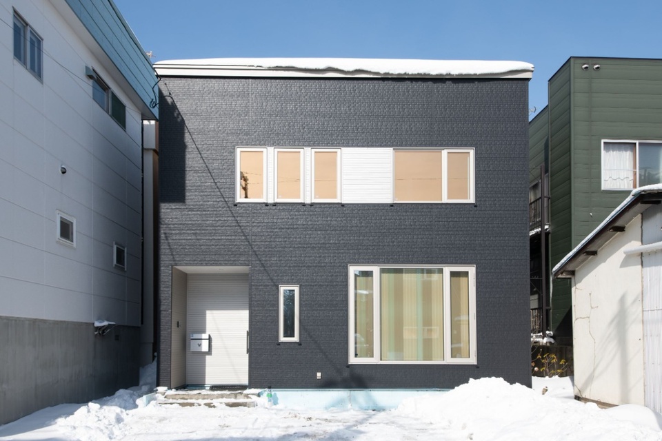2方向の窓から光が差し込む明るい玄関スペース。子どものソリや除雪用具などを置けるように、土間を広くつくっています。