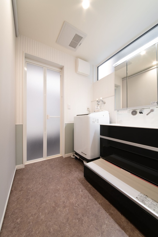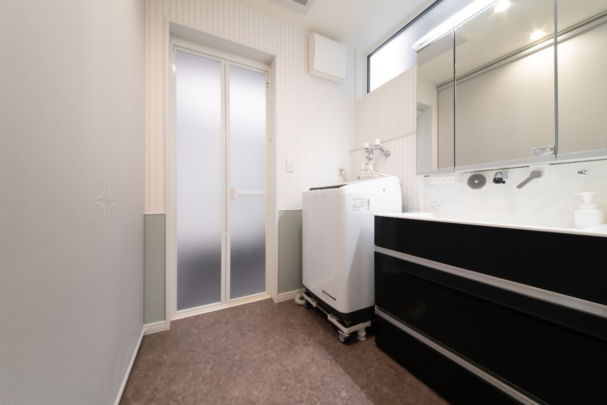 また、洗面化粧台のいちばん下の引き出しは、足台にもなる優れもの。台の天板下にも収納が可能です。ご主人がまだ小さなお子さんのためにセレクトしました。