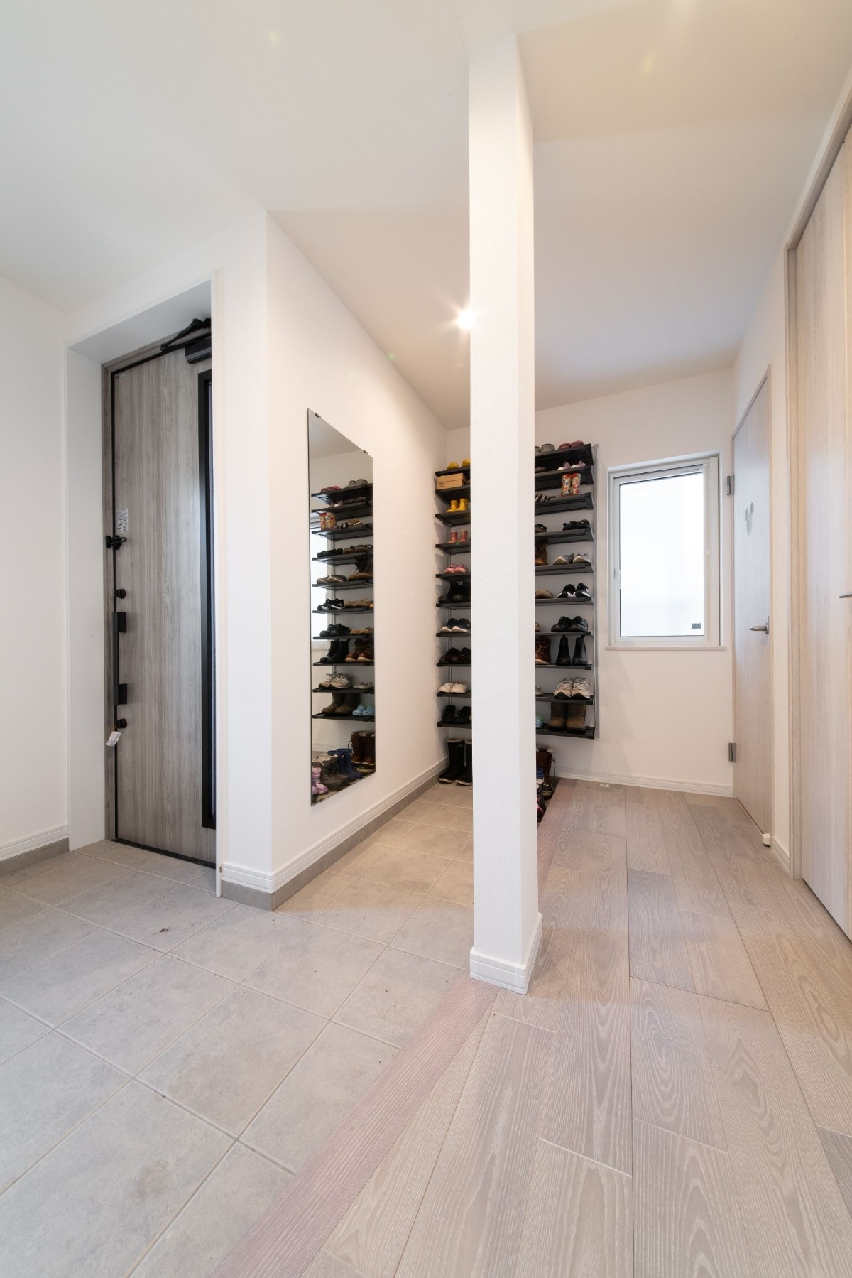 玄関土間の壁面には大きな鏡と、可動式のシューズラックをプラン。ホールは奥からトイレ、手前はブレイン札幌の提案で扉付きの収納を設けました。