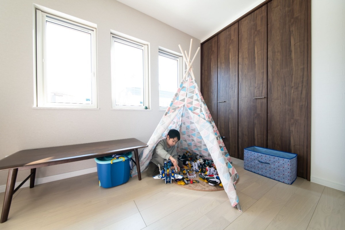 将来は2つの個室に分けられるようにしていますが、今は広々と遊べるスペースとしてオープンに使用。なるべく明るい家にしたいという要望で、子ども部屋にも窓を多めにつけています。