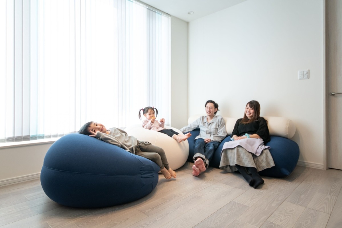 人気のビーズソファ「Yogibo(ヨギボー)」でくつろぐご家族。暖房パネルを使いたくなかったというZさん邸では、輻射熱でじんわりと室内が温まる独自の遠赤外線床暖房を採用しました。ご主人は「床にゴロンとして過ごすのも気持ちいいですよ」と話します。