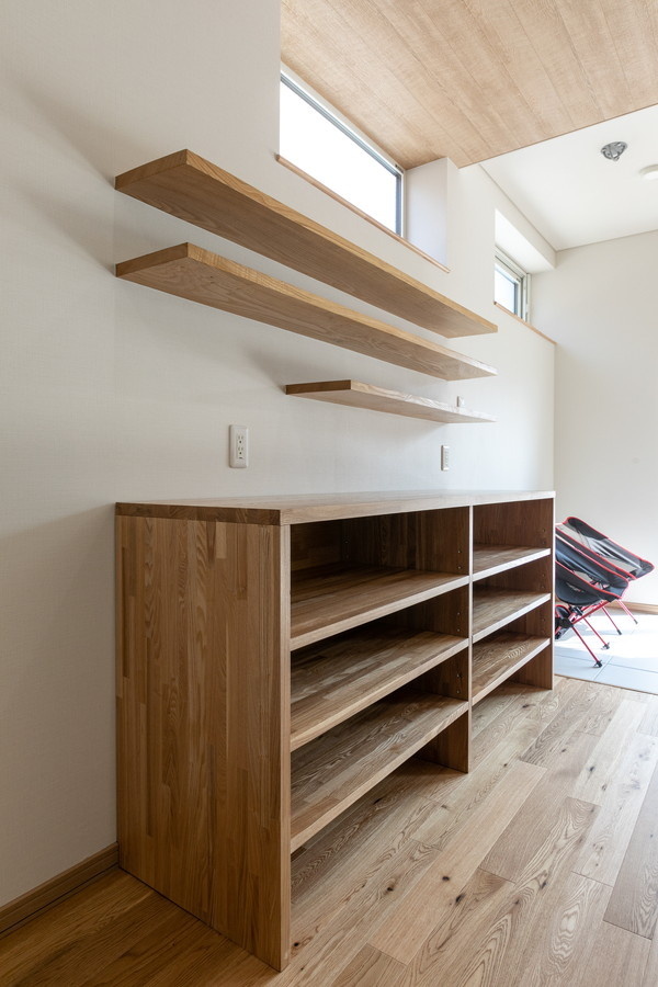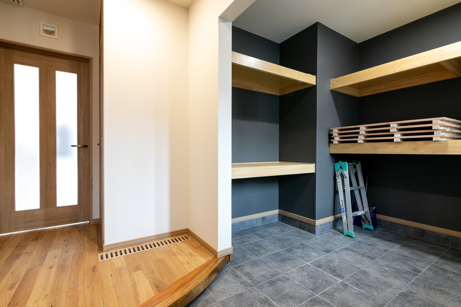 玄関土間は、ロードバイクやアウトドア用品が収納できるよう奥まで続いており、壁面には丈夫な収納棚が設置されています。