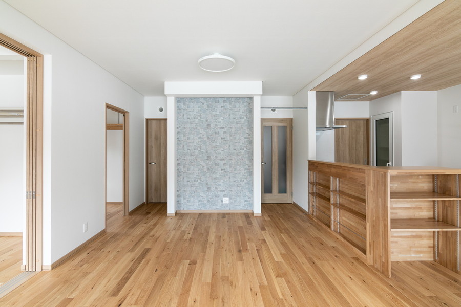 上部に間接照明をつけたテレビコーナーを中心とするダイニング。対面式のキッチンには、腰壁の全面に収納を造作。床の雰囲気に合わせナラの集成材を使っています。本好きなご家族の愛読書や雑誌などの収納にも重宝しそうです。