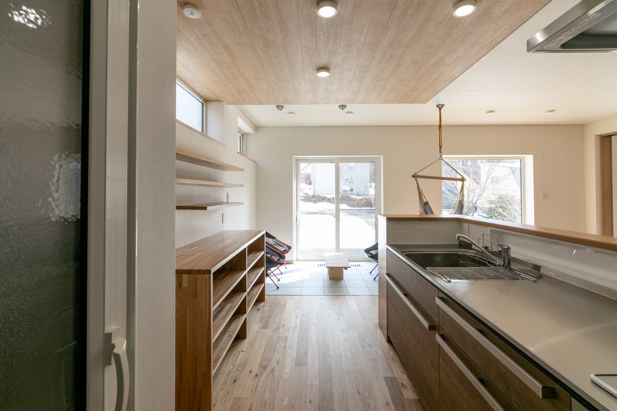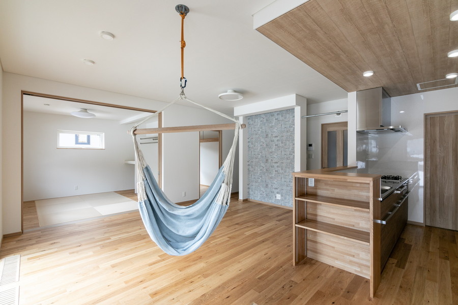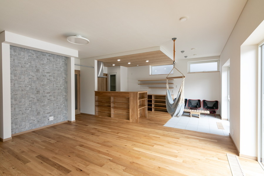キッチン横にはアウトドアスペースも。ハンモッグを吊り下げるフックもつけてもらいました。また玄関土間を広く確保し、自転車やアウトドア用品が収まる収納も希望しました。