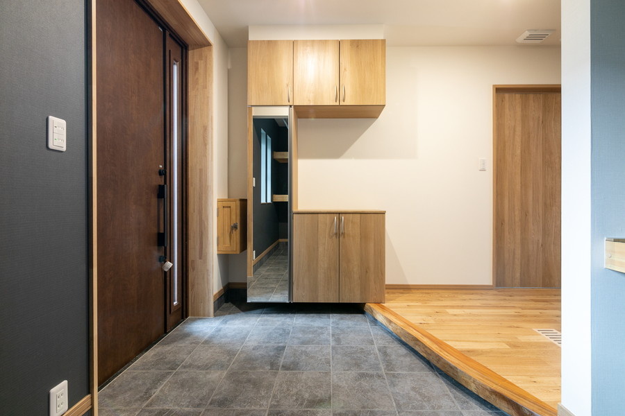 玄関は石目調のタイルやブラックの壁紙を使い、モダンで落ち着いた雰囲気です。
