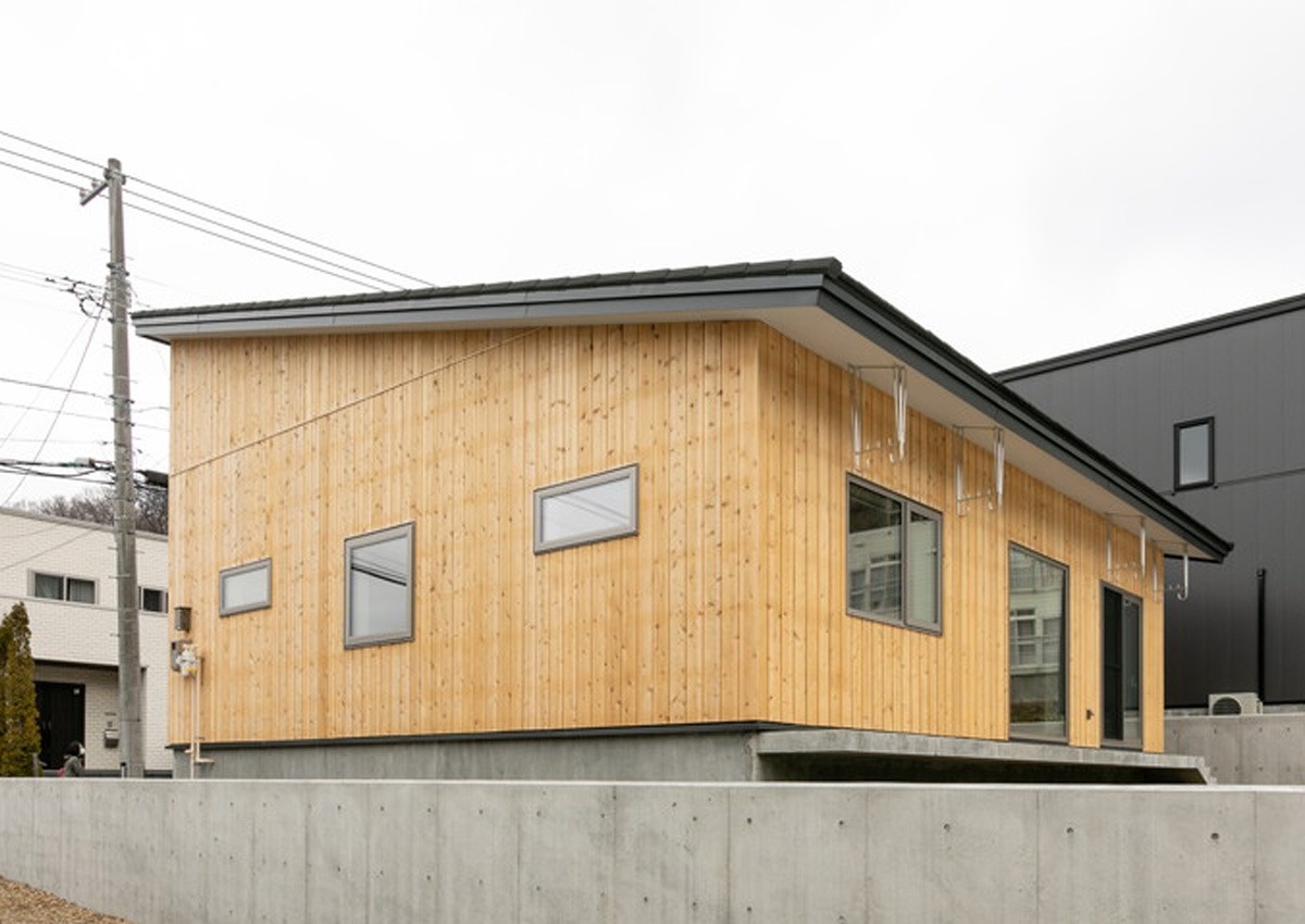 М邸でも、道南杉で外装仕上げを行うにあたっては、不燃下地を省略でき、外壁の軽量化や施工コスト削減につながる最新技術、道総研・北方建築総合研究所開発の「北総研防火木外壁」(国土交通大臣の防火構造認定取得済)を採用するなど、先進の取組を行っています。