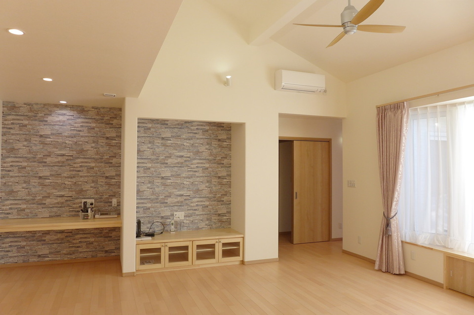 リビングは三角の屋根形状を生かした吹上げ天井に、シーリングファンや石目調のクロスでリゾートのような開放感を演出。大きな窓からは庭の様子が眺められます。