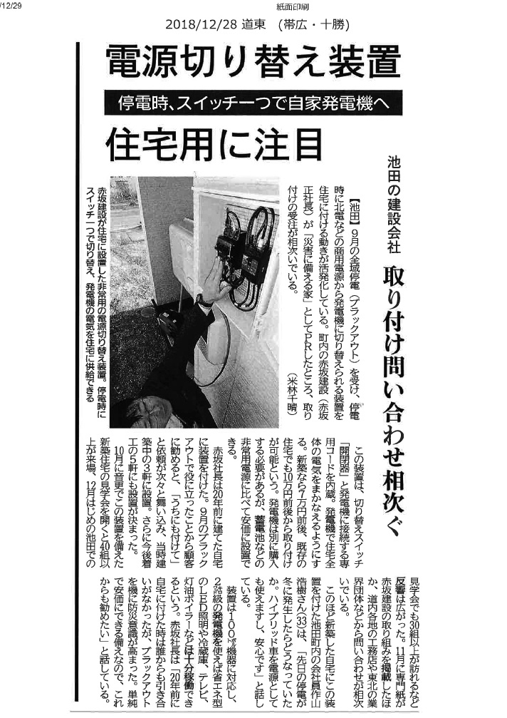 2018年9月の全域停電(ブラックアウト)を教訓に、標準仕様化を実現。非常時に備え、安心な暮らしをお届けしています。新聞でも取り上げられました。