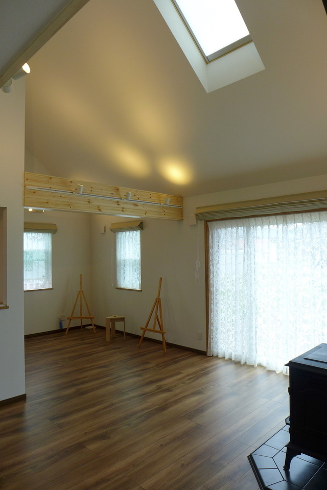 傾斜屋根を生かした吹抜のリビング。希望だった天窓も付いています。リビングの壁は塗壁で、ご主人自らDIYで仕上げました。