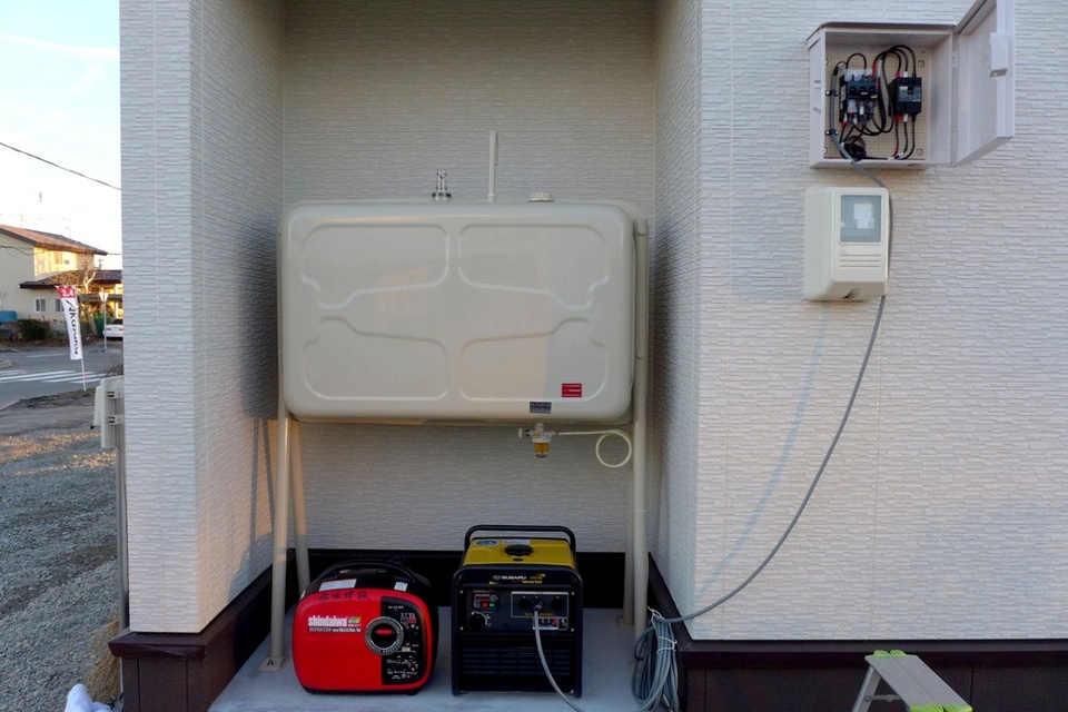 こちらは災害対策として赤坂建設が標準仕様としている非常用電源切り替え装置(右上)と発電機(灯油タンク下)。