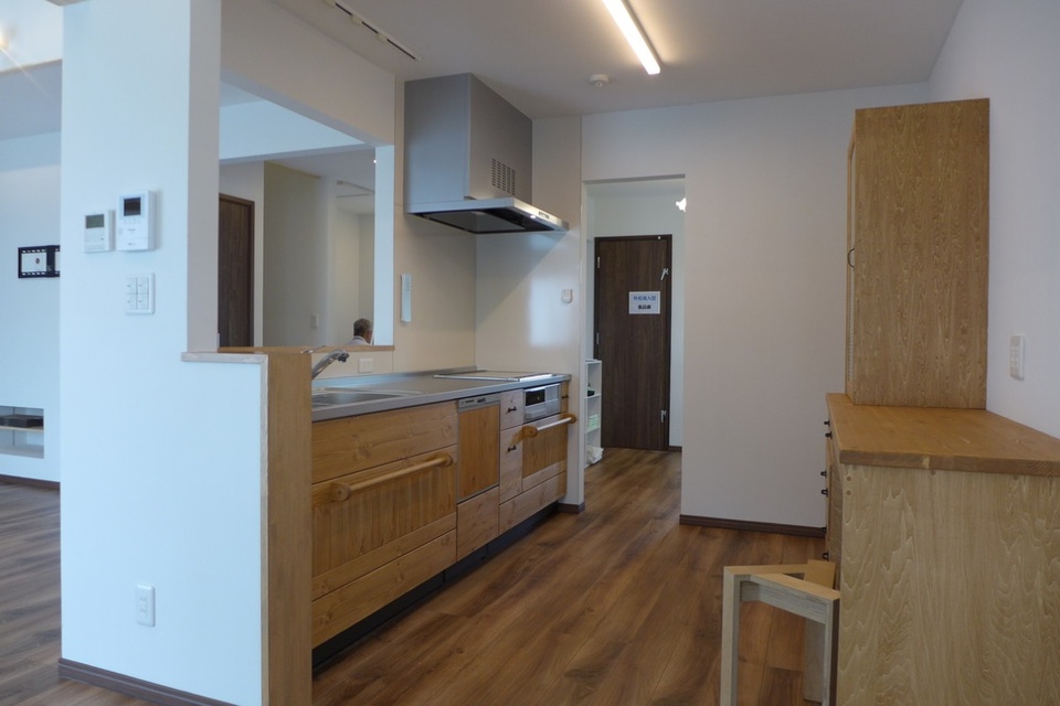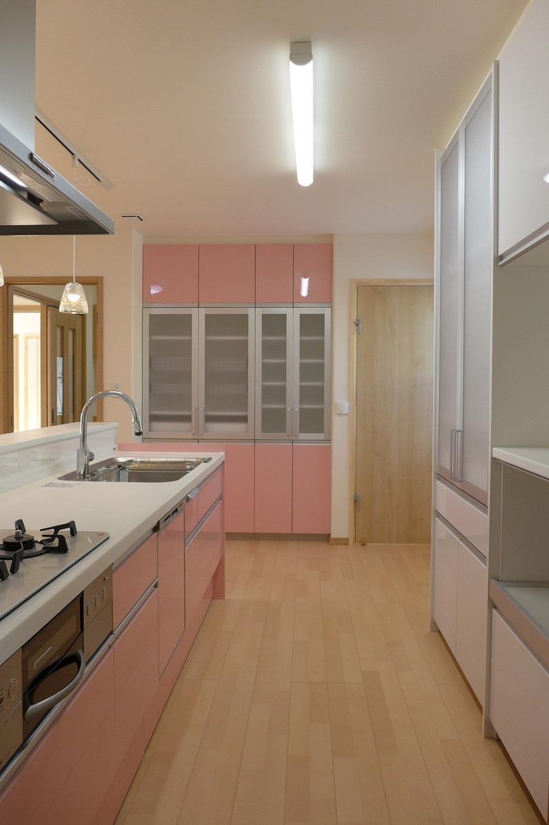 面材に天然木を使ったキッチンは奥さまのご希望でした。
