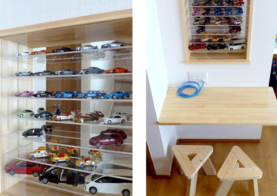 こちらは旦那さまがコレクションしているミニカー専用のコレクション棚。手前にはPC作業などに便利なカウンターを付けました。
