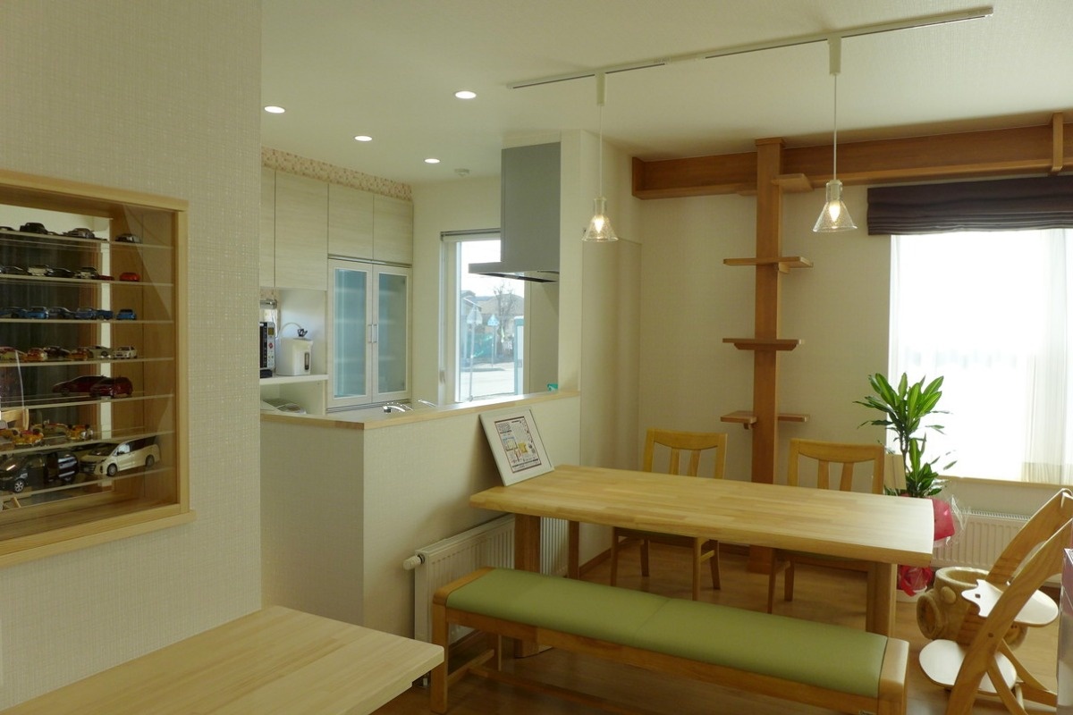 キッチンは対面式で、家族の時間を大切に。そして配膳や片づけも家族みんなでできる造りです。そしてリビングには愛猫のキャットウォークも造作しています。