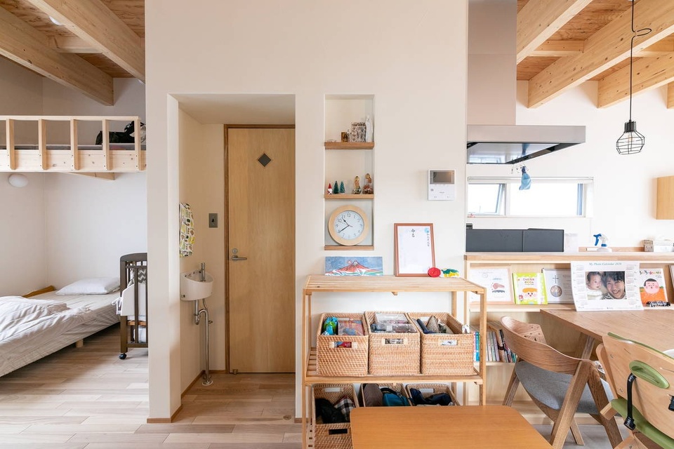 LDKや子ども部屋がありました。お子さんのための絵本はキッチン前の造作カウンターにディスプレイ収納されています。