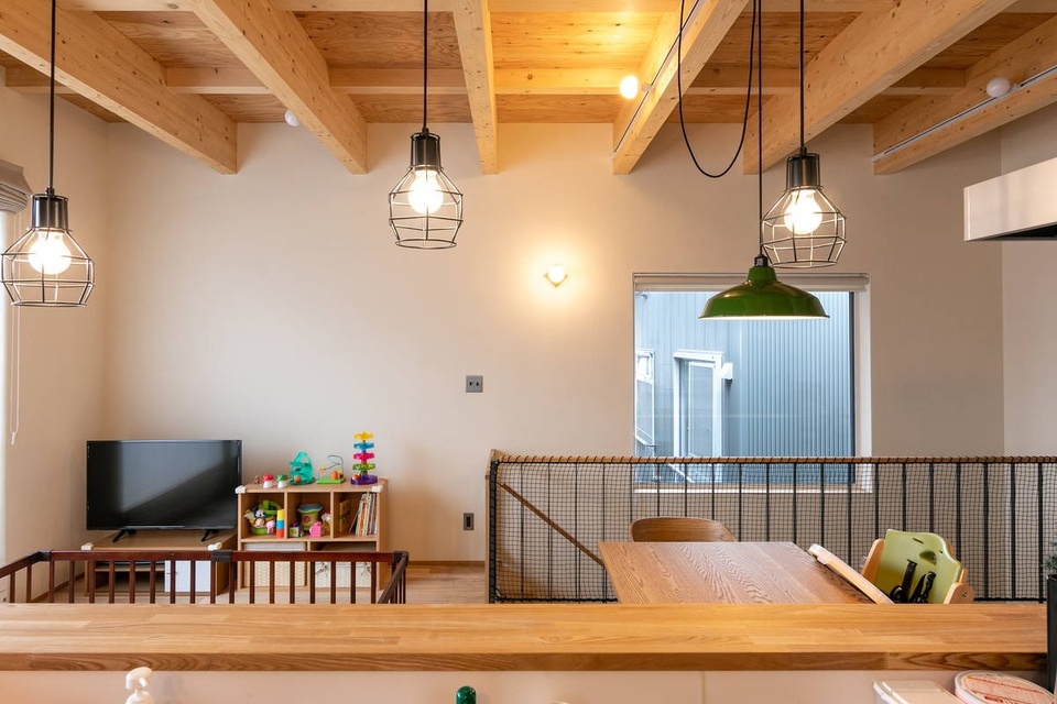 リビングが明るく、開放感もいっぱいなのは、2階リビングの南東側の道路面に大きな窓を配置したこと。壁や屋根の外側で断熱するSHS工法なので天井が現しになっていることもあり、2階天井は高い場所で2.9メートルと高いためです。