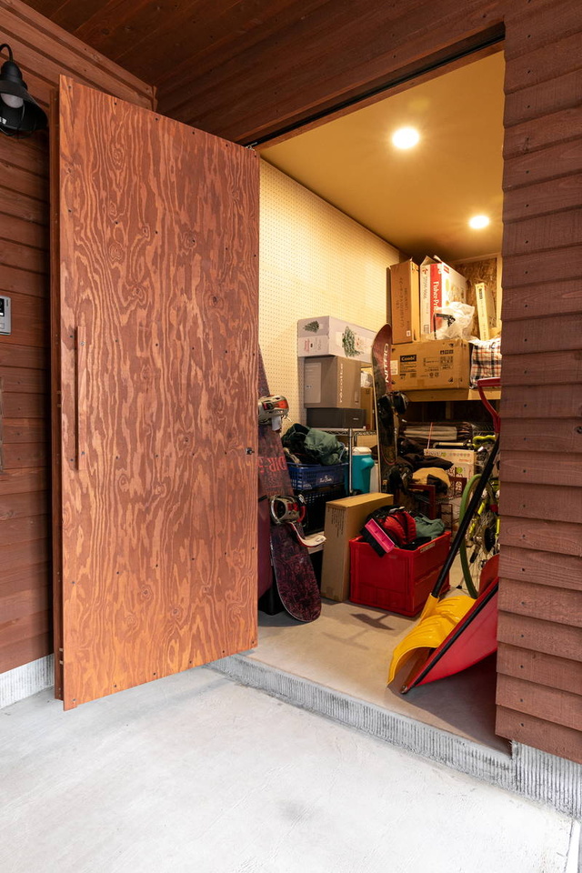 玄関横には住宅と一体化した大型の物置が。スノーボードや自転車などのアウトドア用具などをたっぷり収納できます。壁には現場管理を担当した小林さんと相談して、住宅完成後に有孔ボードを追加設置し収納力も強化しました。